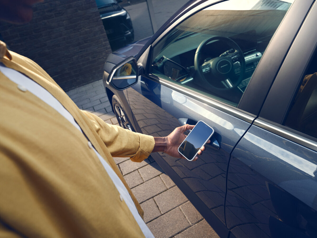 KONA galima atrakinti išmaniuoju telefonu, pridėjus jį prie vairuotojo ar keleivio durų rankenos.